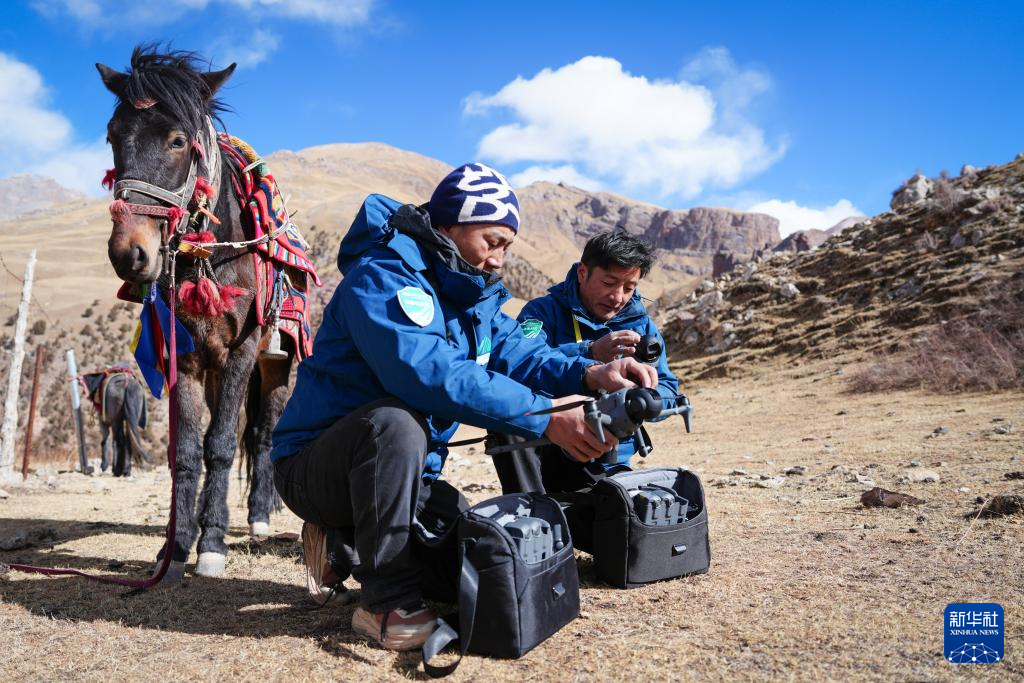 1月29日,次丁(左)和更尕在青海省玉树藏族自治州杂多县昂赛乡巡护中准备使用无人机。
