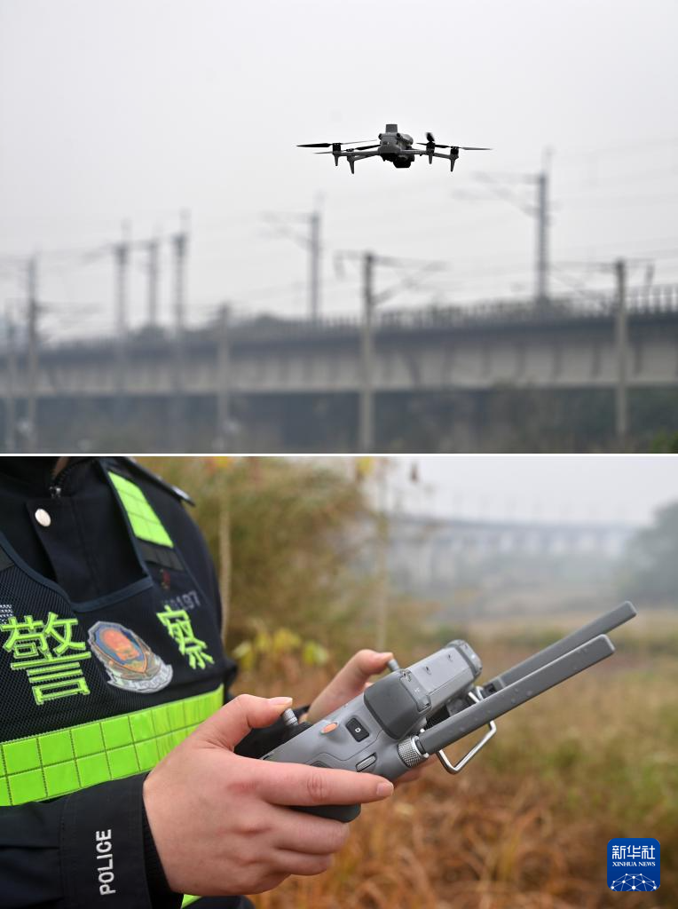 2月4日,南宁铁路公安局北海公安处五象南站派出所民警在南宁市良庆区用无人机进行铁路线路巡防。