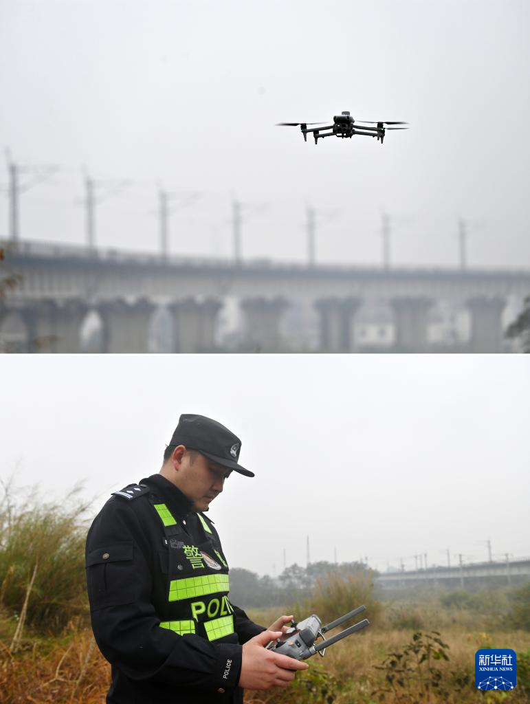 2月4日,南宁铁路公安局北海公安处五象南站派出所民警操控无人机在南宁市良庆区进行铁路线路巡防(拼版照片)。