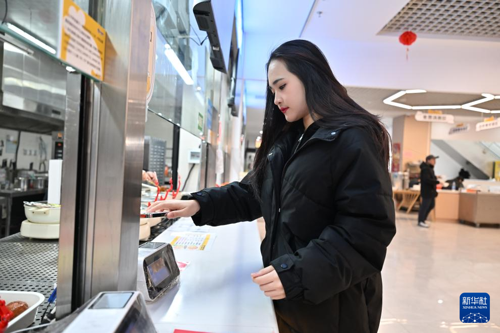 泰国学员黄雅仪在中国民航大学使用支付宝进行午餐付费(1月20日摄)。