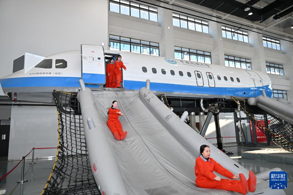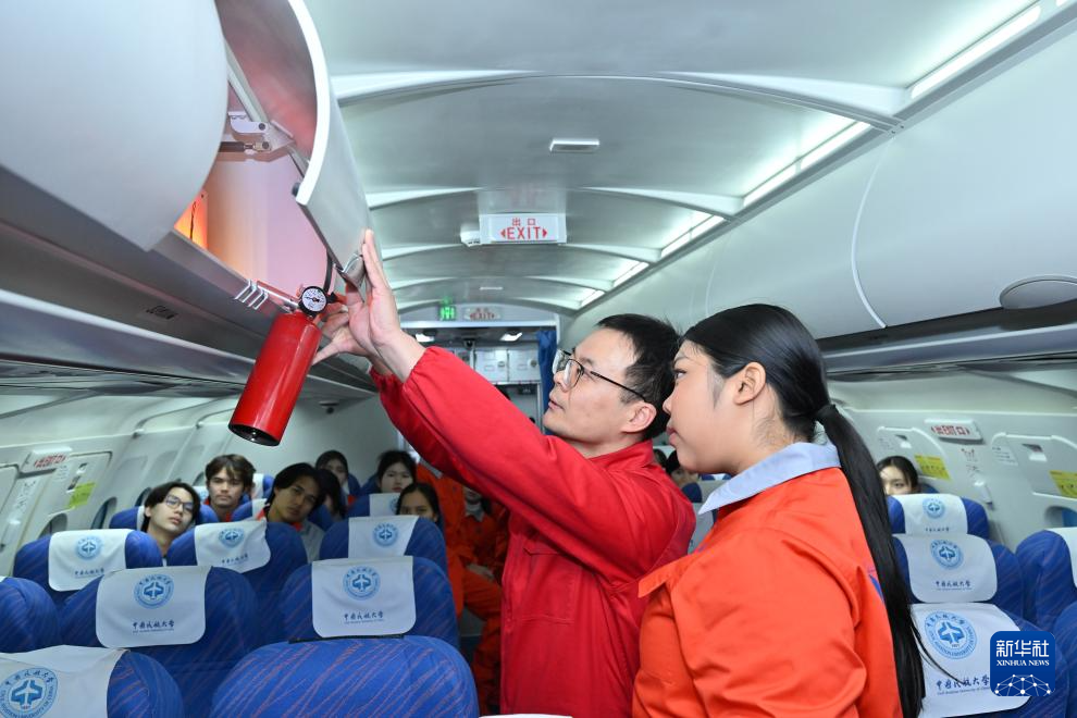 中国民航大学教师迟壮(右二)在客舱模拟器中向泰国学员进行客舱安全课程授课(1月20日摄)。