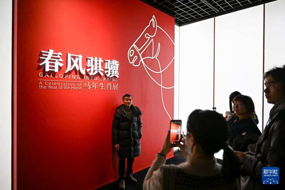 2月4日,观众在“春风骐骥:马年生肖展”展板前拍照留念。