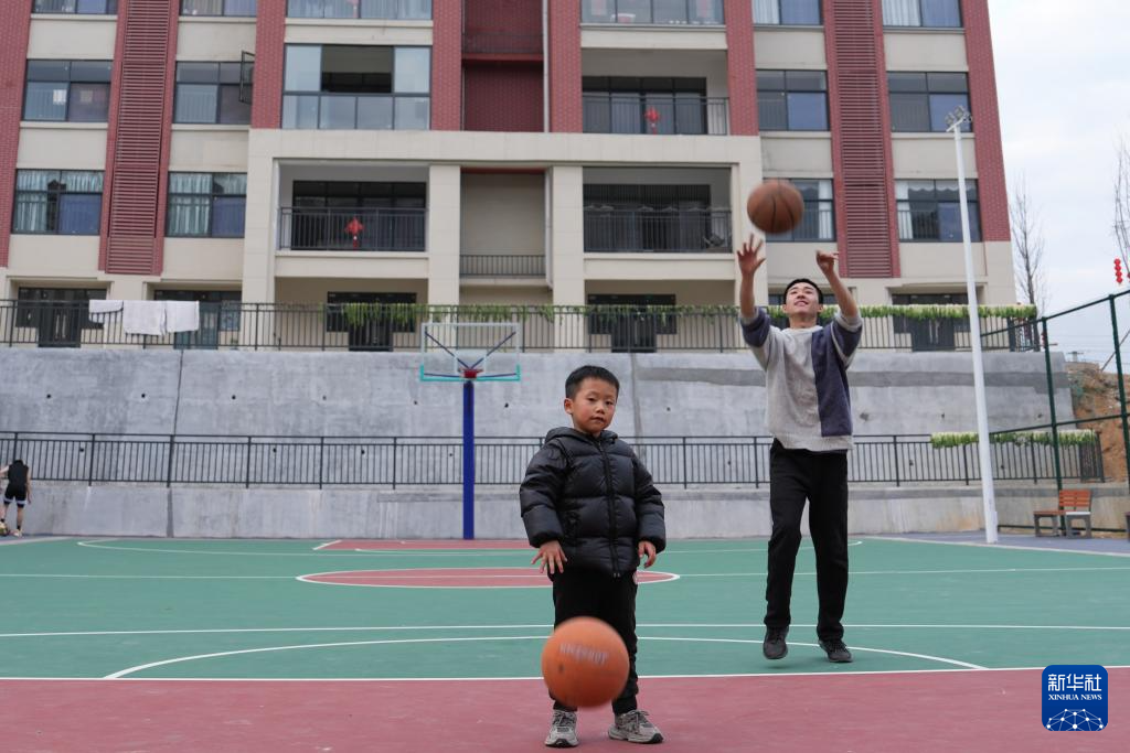 2月4日,小朋友在资兴市兴宁镇集中安置点福兴苑小区玩耍。