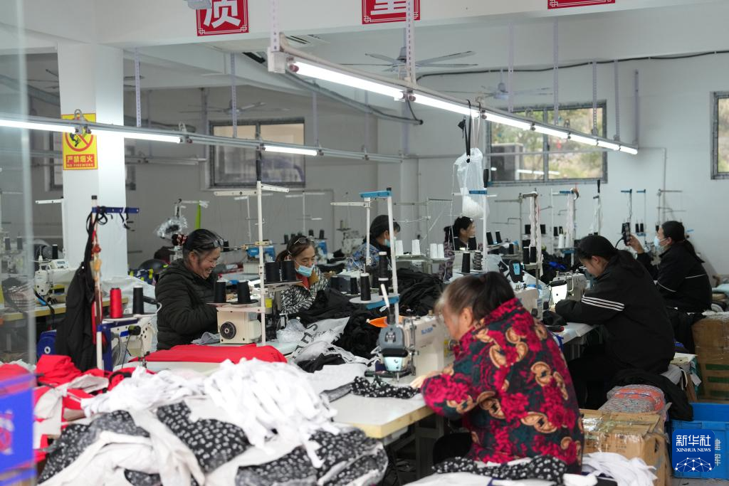 2月5日,当地群众在资兴市州门司镇集中安置点福祥苑小区旁的服装厂工作。