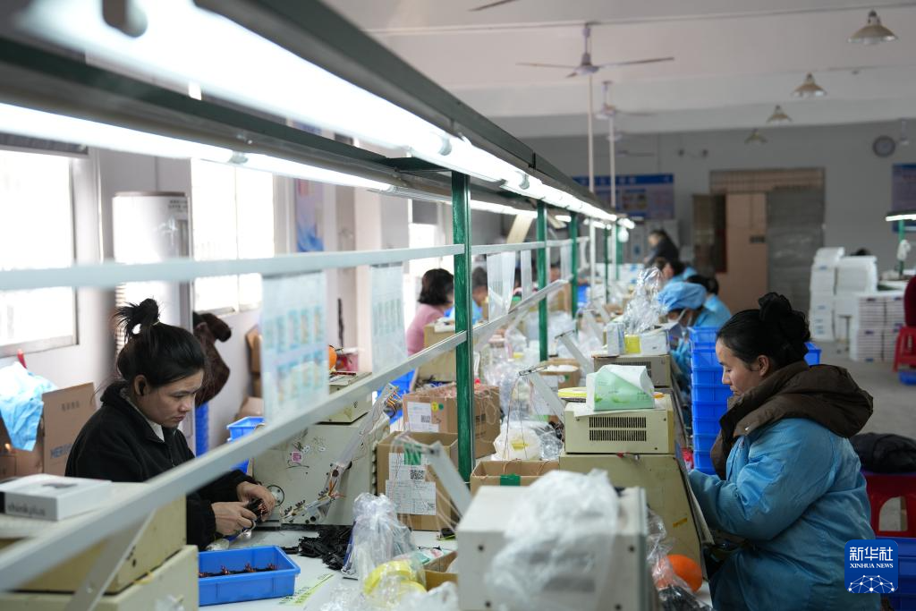 2月5日,当地群众在资兴市八面山瑶族乡集中安置点同心家园小区旁的电子厂工作。