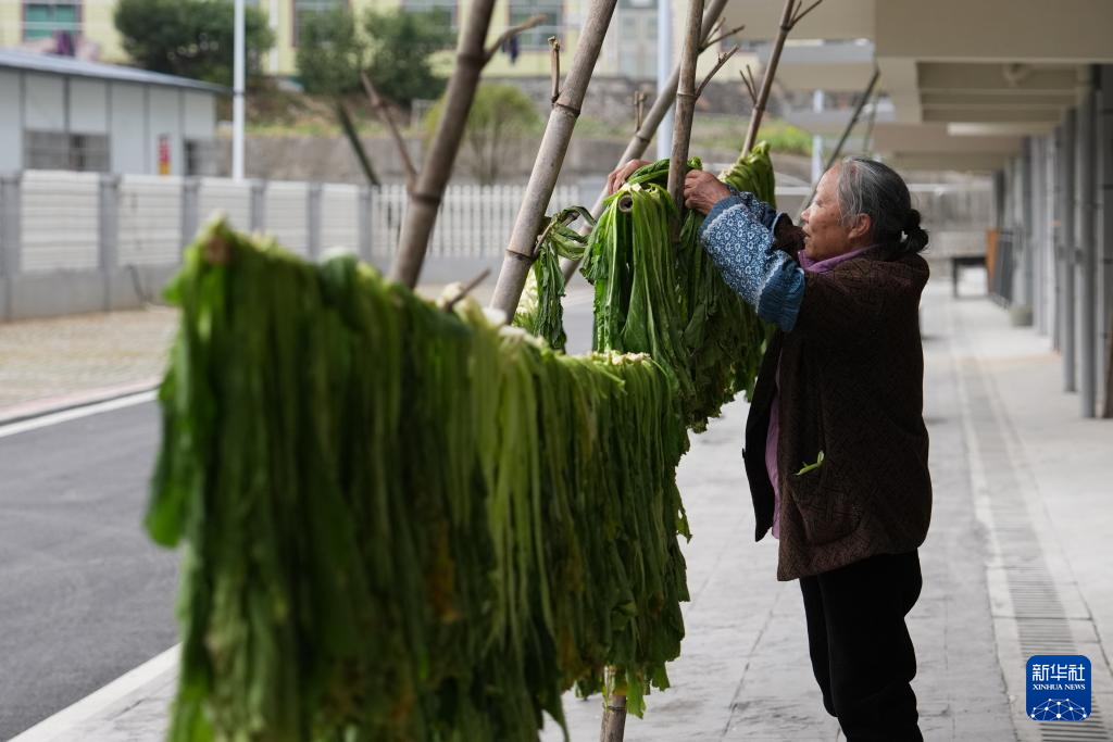 2月5日,在资兴市州门司镇集中安置点福祥苑小区,一位老人晾晒用来腌制的蔬菜。
