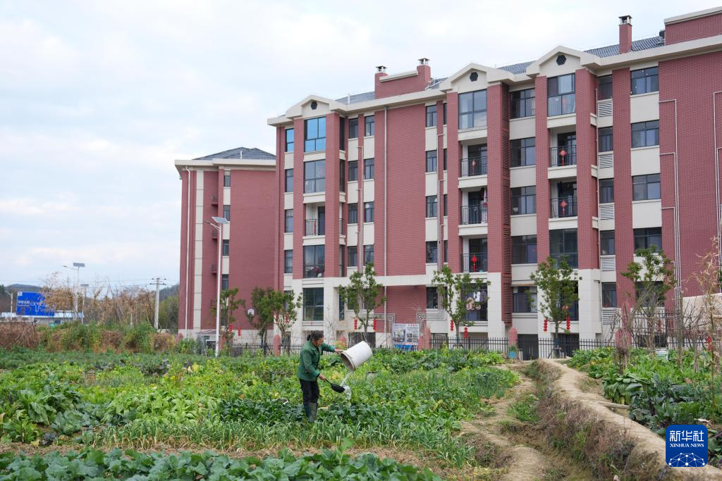 2月4日,在资兴市兴宁镇集中安置点福兴苑小区旁,当地群众给菜园内蔬菜施肥。