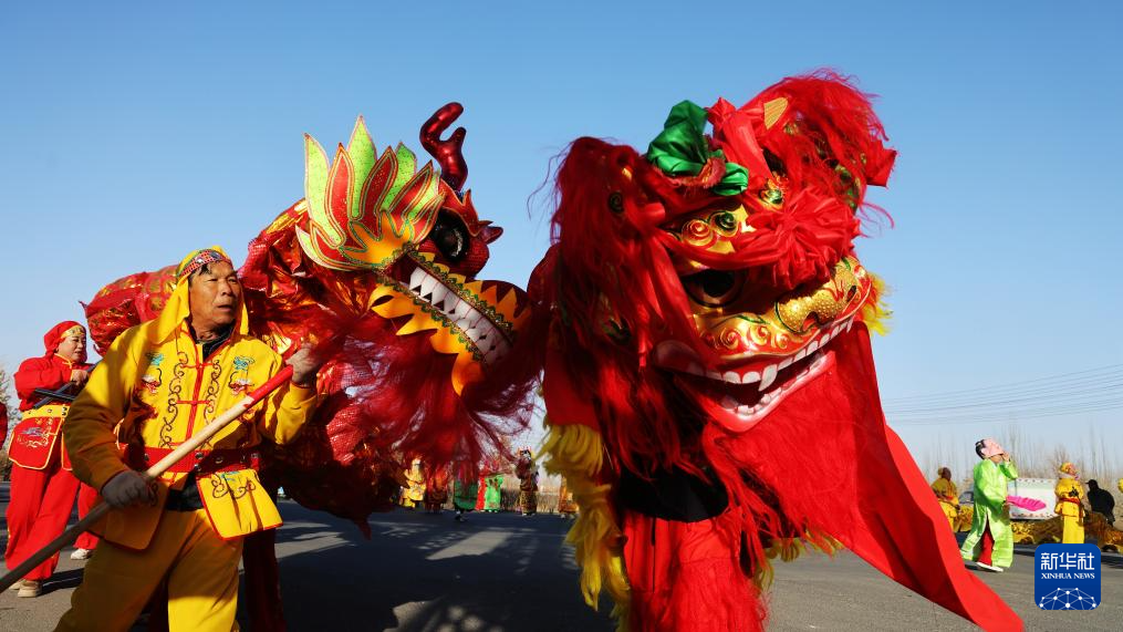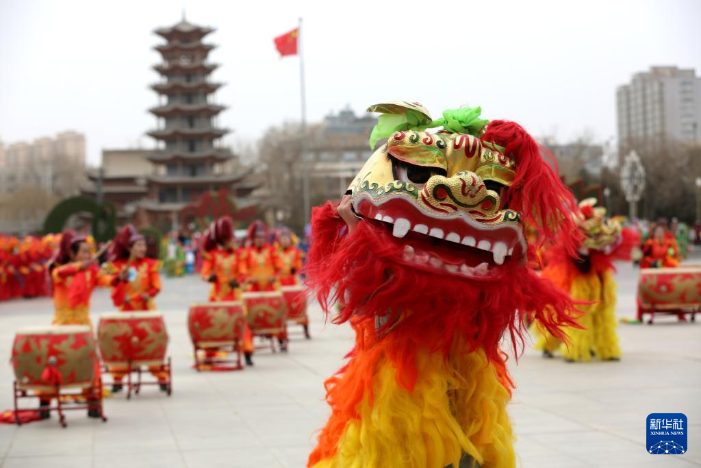 2月5日,非遗社火队在甘肃省张掖市甘州区中心广场进行舞狮表演排练。