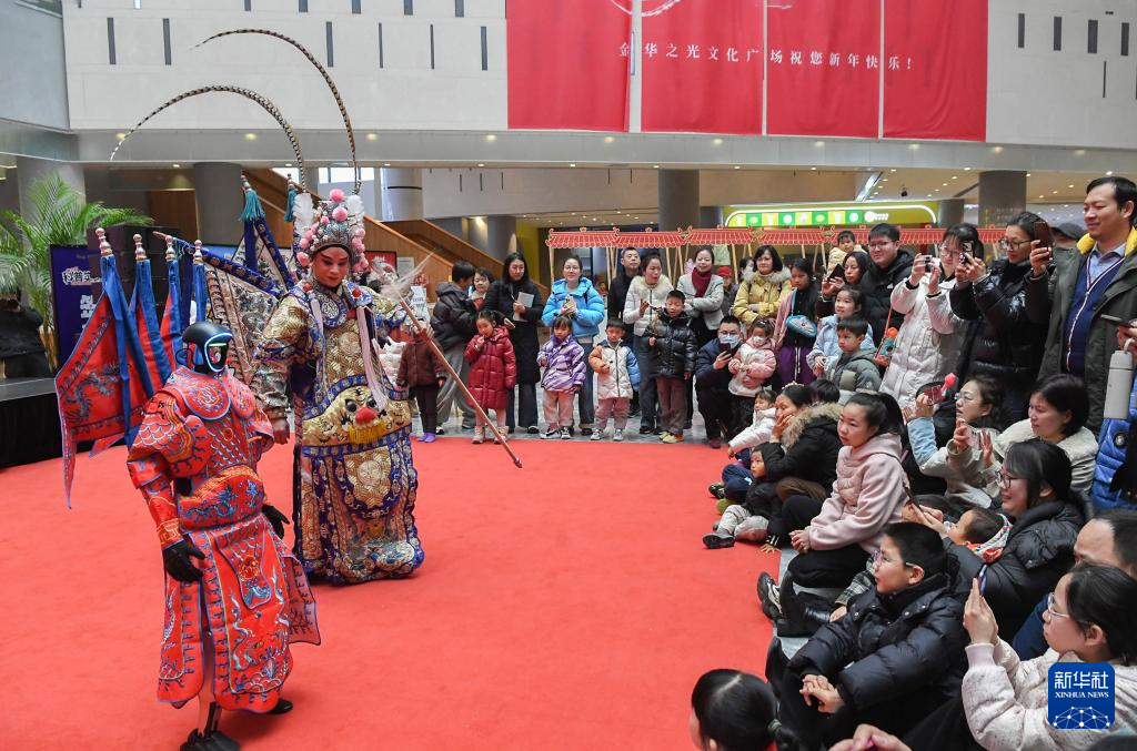 2月7日,在浙江省金华科技馆,婺剧演员与机器人一起表演婺剧。