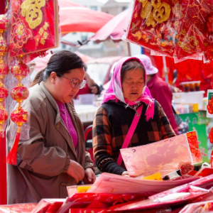 2月7日,在河南省商丘市夏邑县龙湖天街一家饰品商店,市民在选购春节饰品。