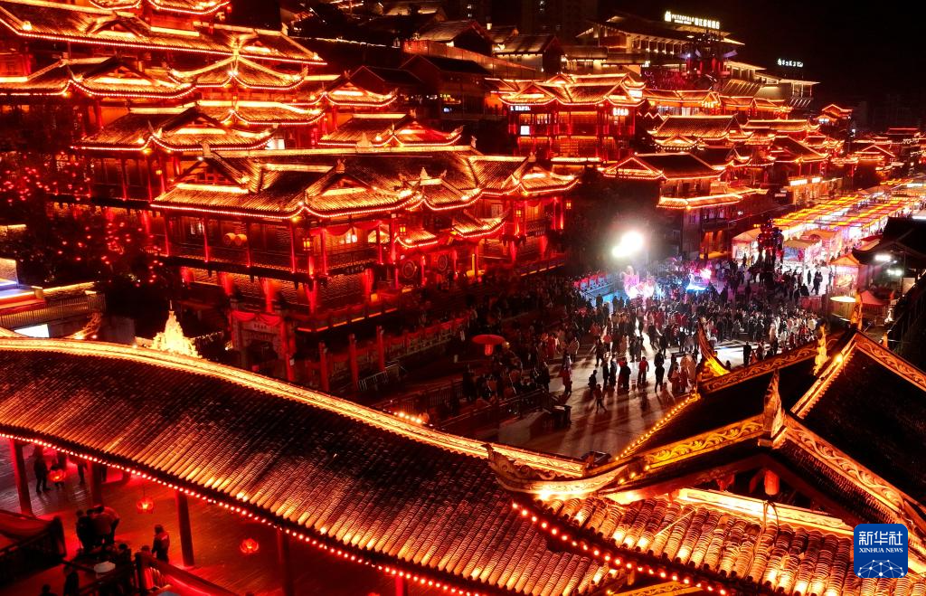 2月6日,市民和游客在湖北省宣恩县贡水河畔观灯游玩赏夜景(无人机照片)。