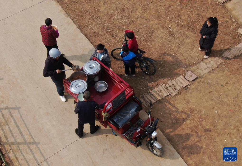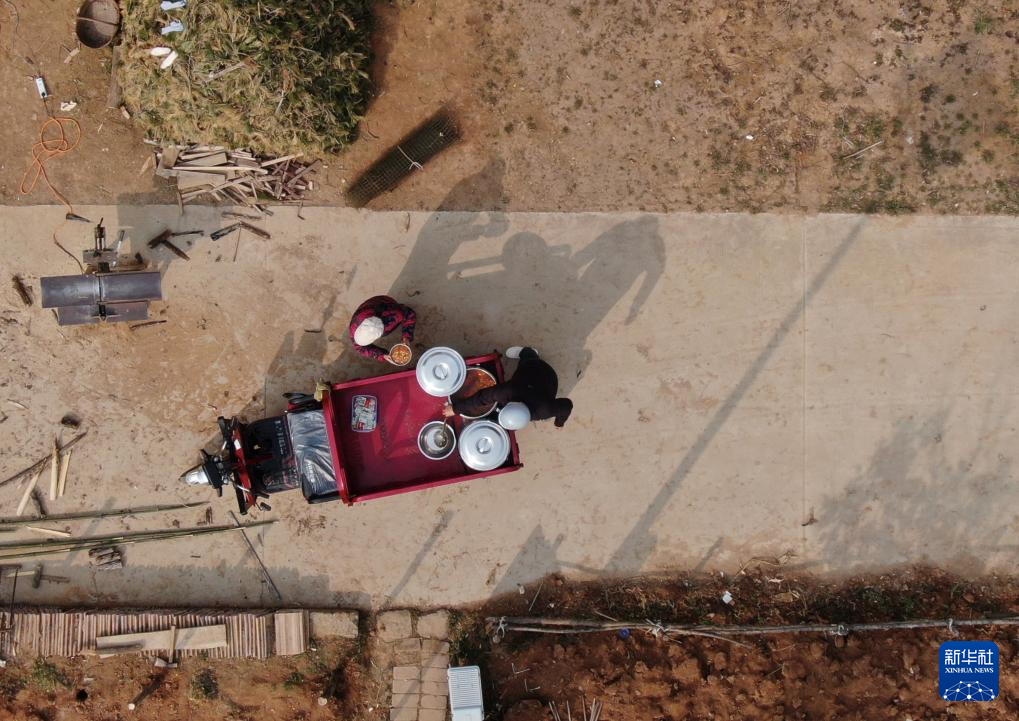 2月6日,庞富强为里峪湾村中的老人送午饭(无人机照片)。