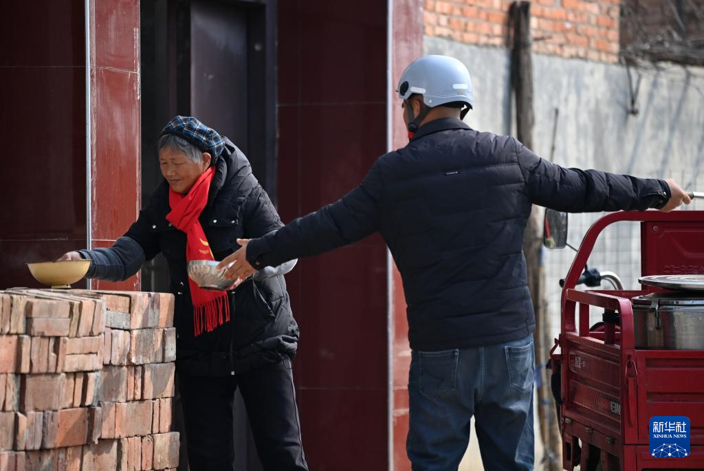 2月6日,庞富强为里峪湾村中的老人送午饭。