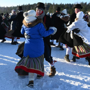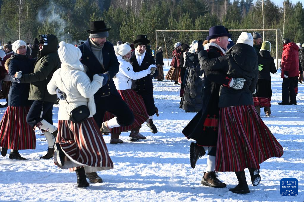 2月7日,在爱沙尼亚东北部小镇科赫特拉-诺梅,人们身着民族服装参加冬季舞蹈节。