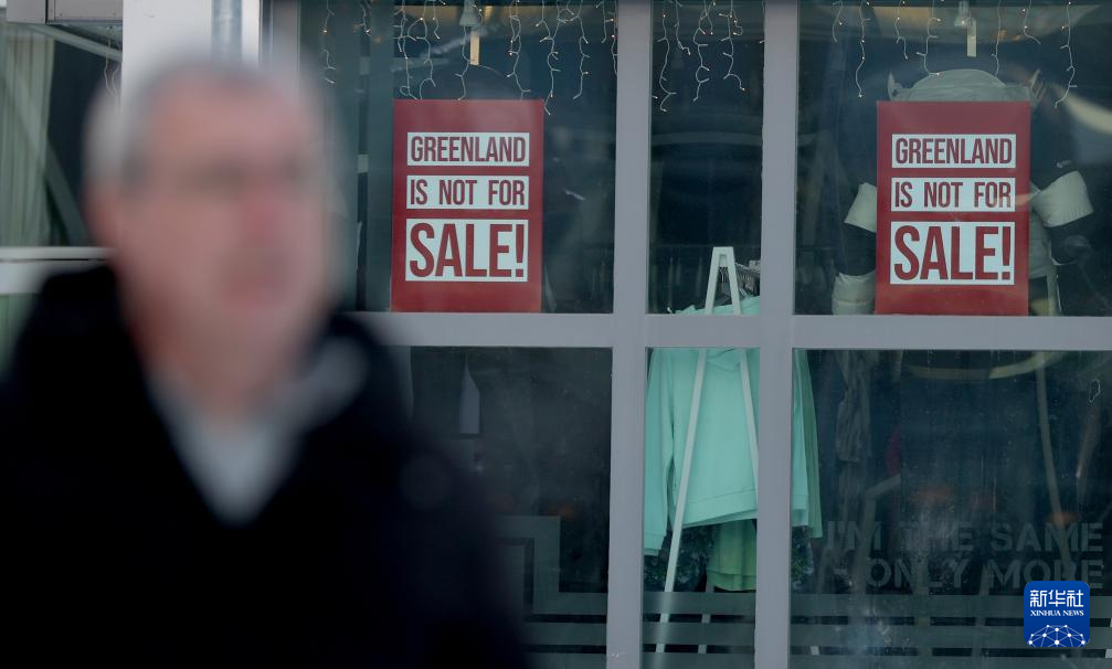 这是2月8日在丹麦自治领地格陵兰岛首府努克拍摄的商铺橱窗上贴着的“格陵兰岛不出售”海报。