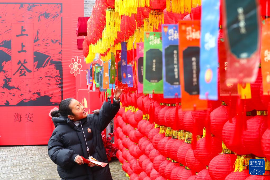 2月10日,小朋友在江苏省海安市博物馆(韩公馆)猜灯谜。