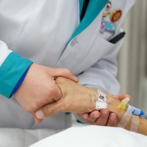 2月5日,在丰台区蒲黄榆社区卫生服务中心,医务社工郭翠红(左一)握着一名70岁的癌症患者的手和她交流。