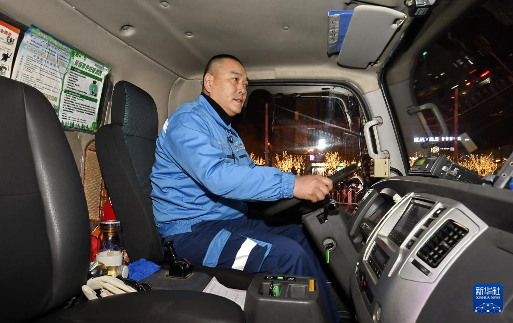 北京环卫集团餐厨垃圾清运工李宁驾驶清运车辆(2月4日摄)。
