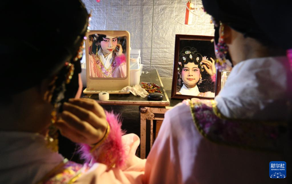 演出前,南国粤剧团演员在后台为演出做准备(2月6日摄)。