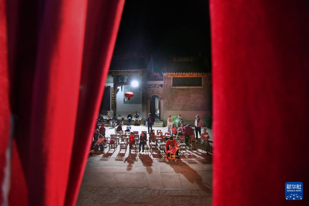 在广东省鹤山市雅瑶镇隔朗村,村民在等待南国粤剧团演出开始(2月7日摄)。