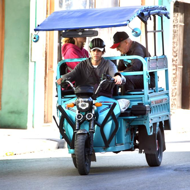 2月10日,在古巴首都哈瓦那,人们乘坐电动三轮车出行。