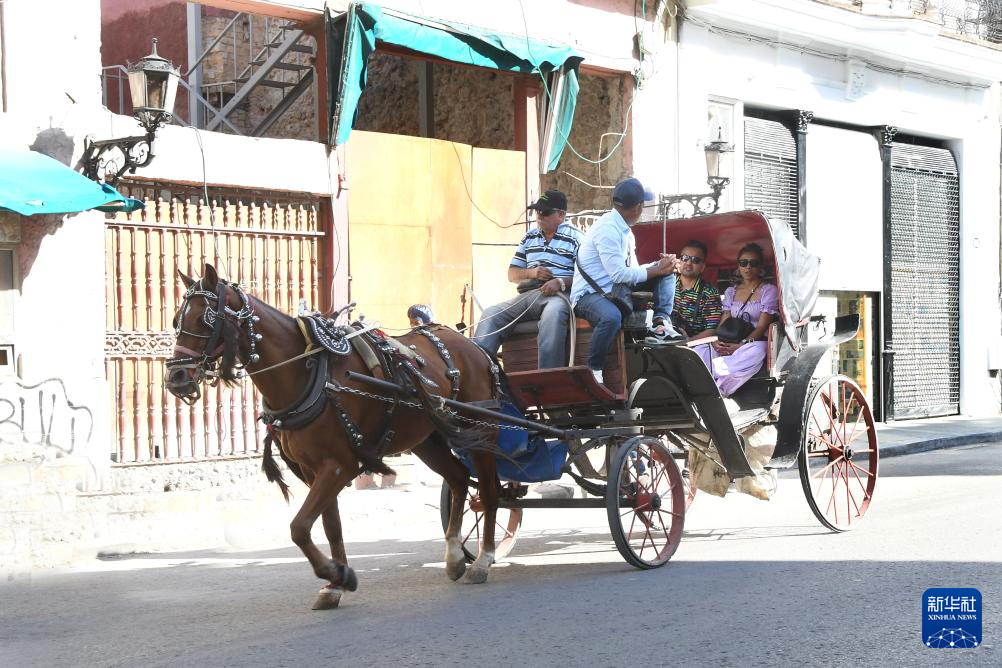 2月10日,在古巴首都哈瓦那,游客乘坐马车出行。