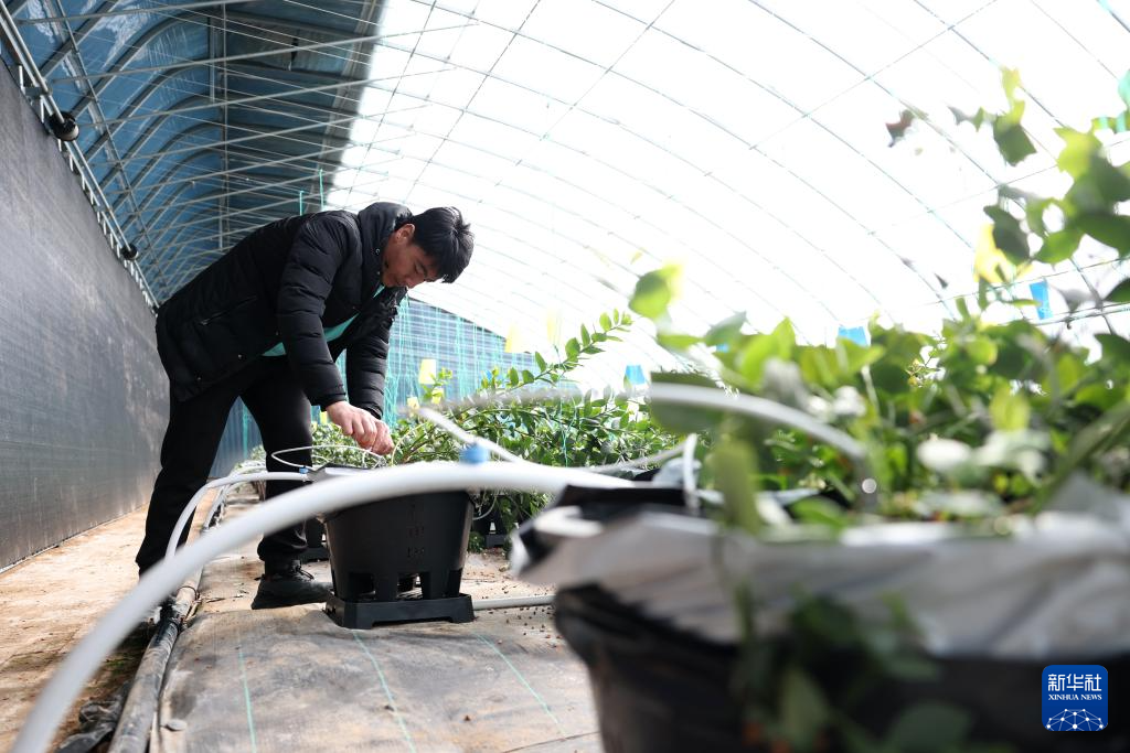 2月12日,一名工人在定西市安定区鲁家沟镇蓝莓种植产业园的温室大棚里查看蓝莓生长情况。