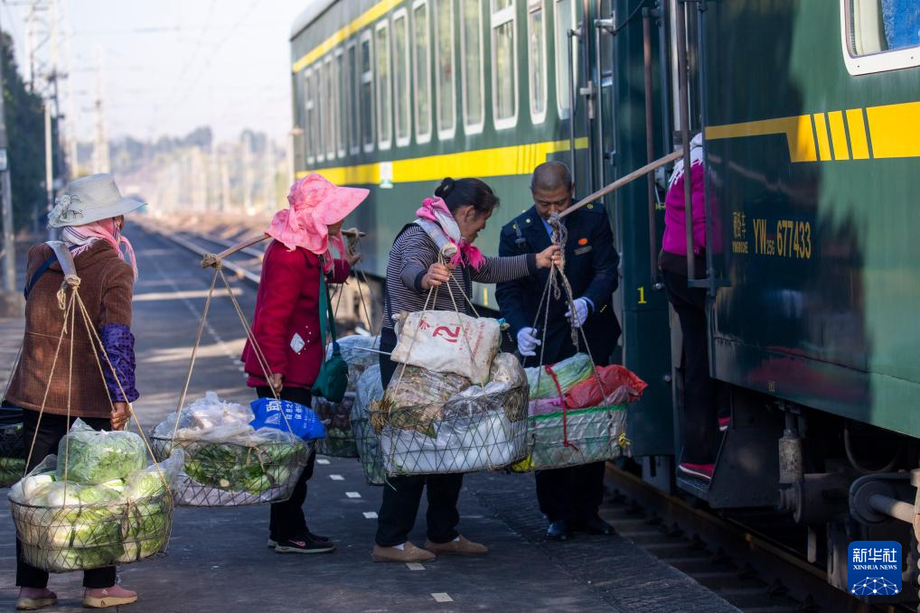 2月13日上午,由昆明开往红果的5652次列车驶入吴官田站。云南省曲靖市马龙县吴官田村的菜农们背着新鲜蔬果、土特产乘坐这趟绿皮火车,在曲靖站下车直奔年货大街售卖。