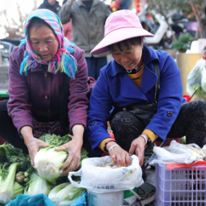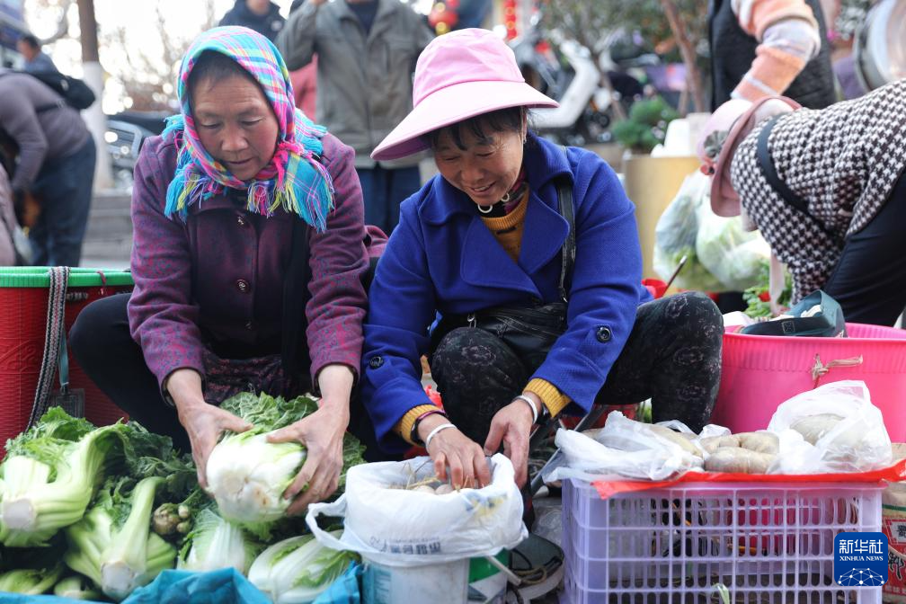 2月13日,乘坐5652次列车、在曲靖站下车的菜农到当地年货大街售卖新鲜蔬果、土特产。