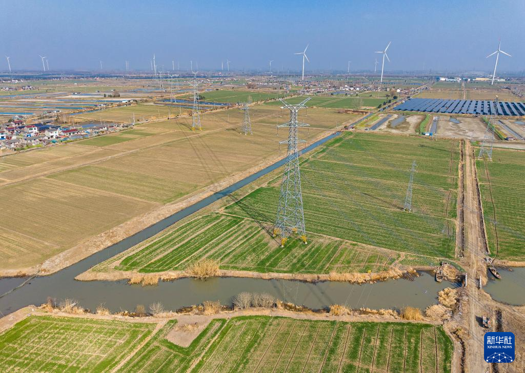2月13日拍摄的运行中的位于江苏省高邮市的江苏扬州至镇江±200千伏直流输电二期工程(无人机照片)。