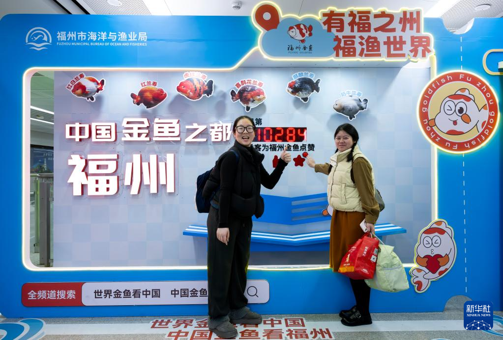 2月15日,两名游客在福州地铁东门站金鱼展示点为福州金鱼点赞。