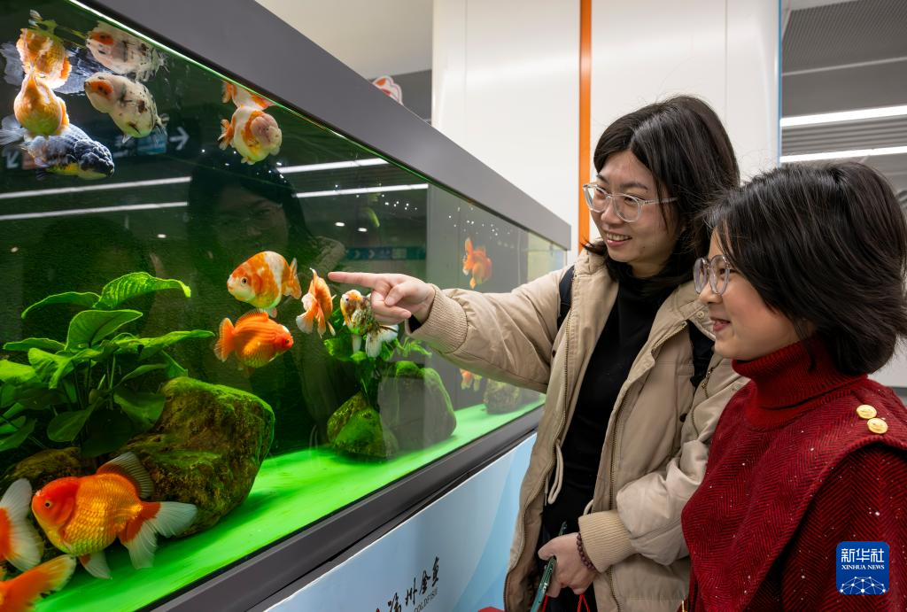 近日,福建省福州市在地铁东门站打造福州金鱼地铁主题站,活体金鱼“游”进城市轨道交通空间,成为新春一道亮丽的风景线。