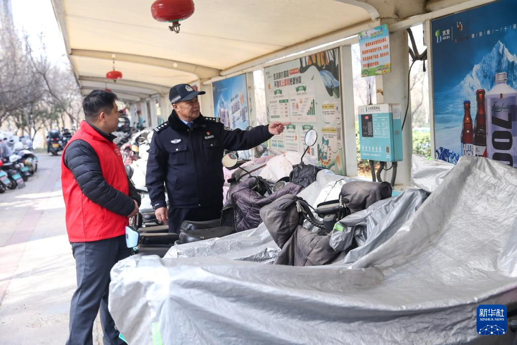 2月16日,山东省济南市公安局市中分局十六里河派出所社区民警陈兴珍(右)与志愿者对小区电动车充电站进行安全检查。