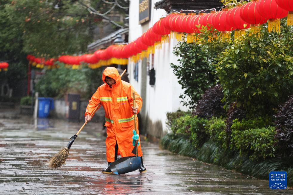 2月16日,在浙江省湖州市德清县乾元镇,环卫工人冒雨清扫街道。