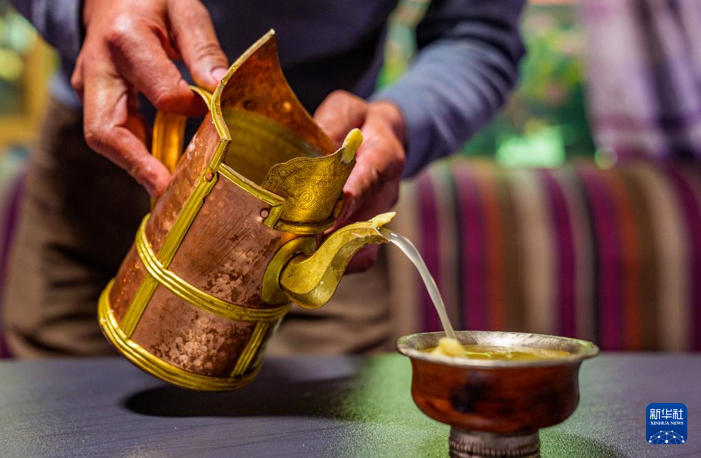 2月16日,在拉萨堆龙德庆区东嘎街道桑木社区,群群在倒青稞酒。