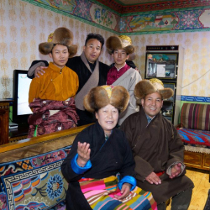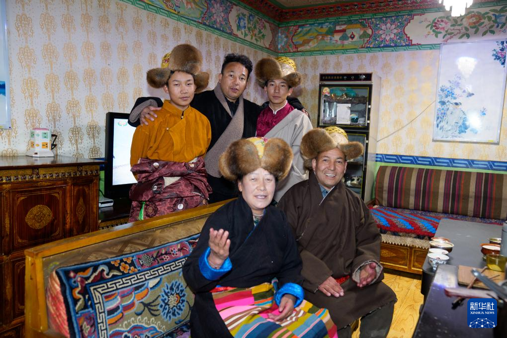 2月16日,在拉萨堆龙德庆区东嘎街道桑木社区,群群的儿子罗桑土旦(后排中)与家人合影。