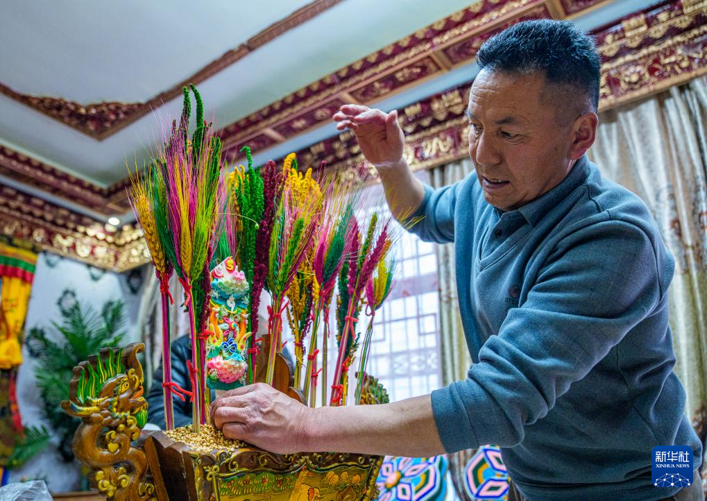 2月16日,在拉萨堆龙德庆区东嘎街道桑木社区,群群在装扮切玛盒(五谷丰登斗)。