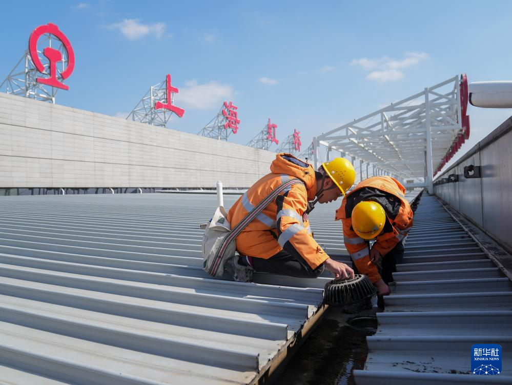 2月17日,中国铁路上海局集团有限公司上海房建公寓段的工作人员在上海虹桥火车站的屋面钢结构上清理垃圾。