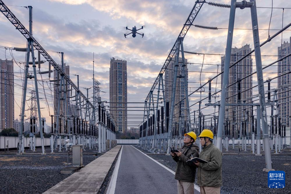2月17日,国网泰州供电公司运维人员在220千伏寺巷变电站利用无人机巡检电力设备。