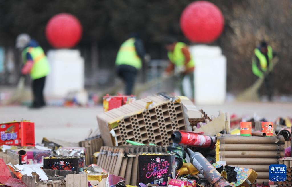 2月17日,黑龙江省齐齐哈尔市建华区环卫绿化服务中心职工在烟花爆竹燃放点清理燃放后的残余碎屑。