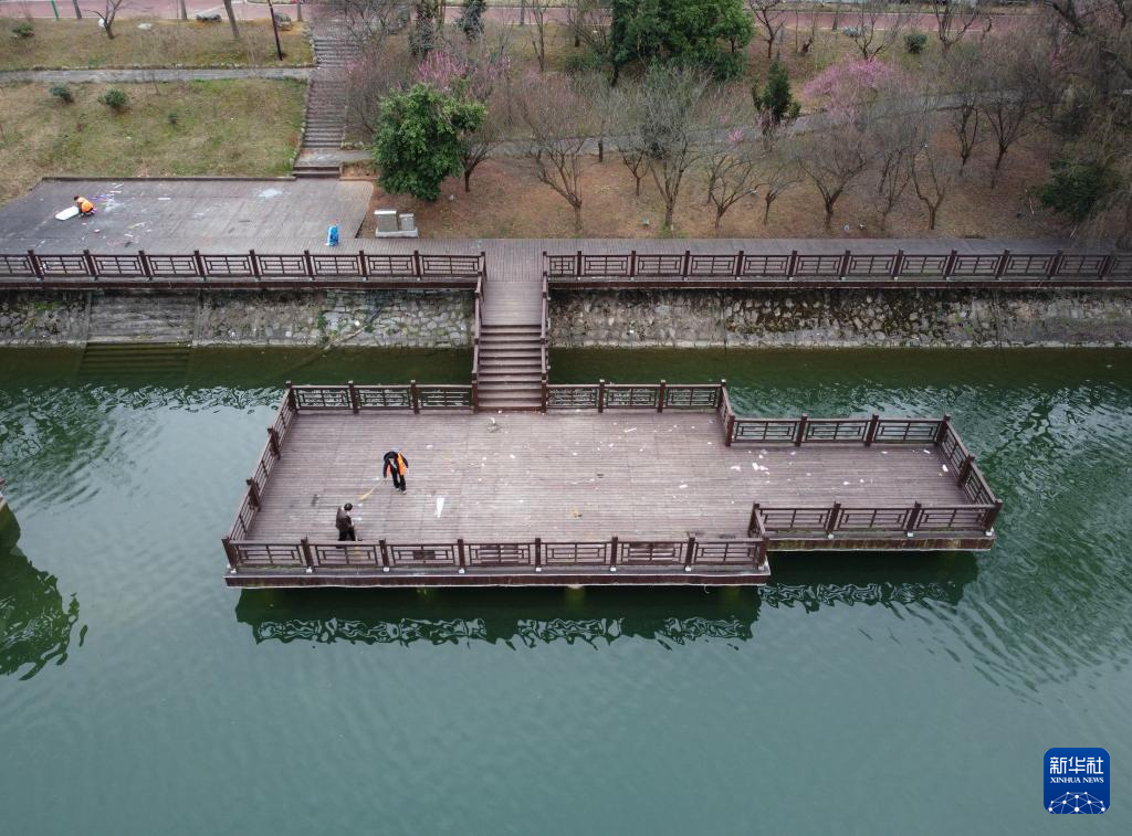 2月17日,环卫工人在贵州省黔东南苗族侗族自治州施秉县河滨公园清扫保洁(无人机照片)。