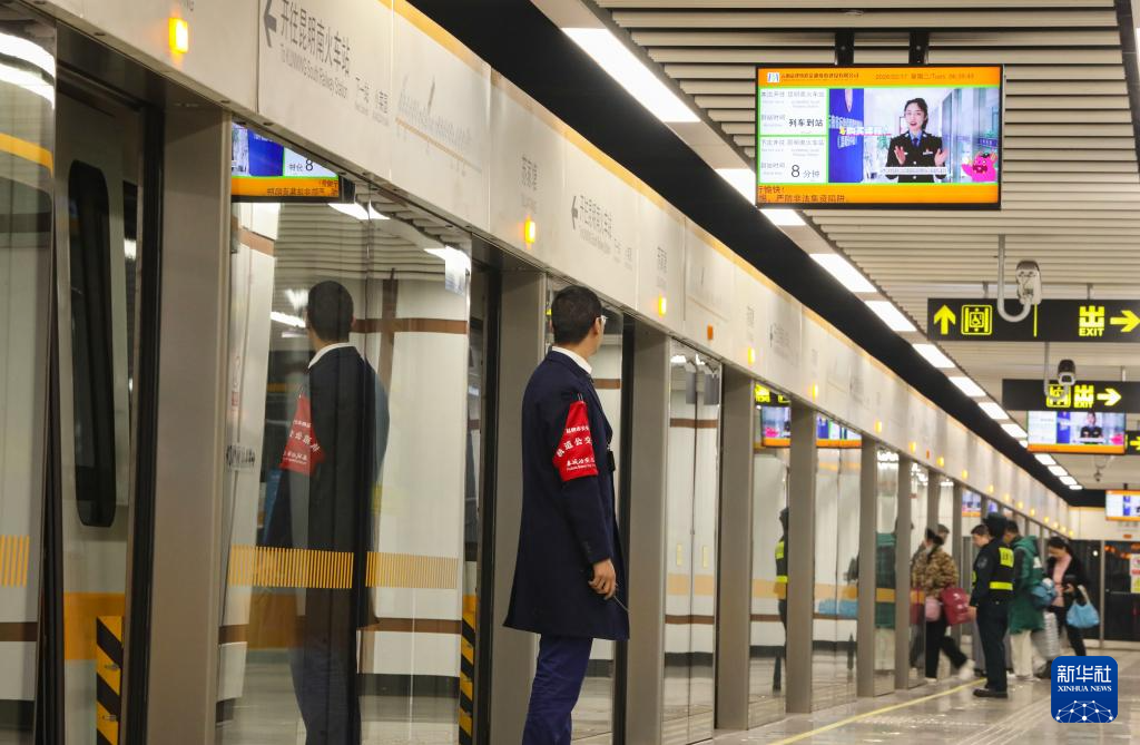2月17日,在云南昆明地铁4号线苏家塘站,站务人员在观察旅客乘降情况。