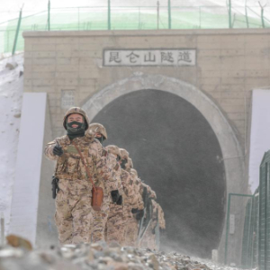 2月16日,在海拔近5000米的昆仑山北麓无人区,武警青海总队海西支队官兵冒着严寒在青藏铁路昆仑山隧道执行巡逻任务。