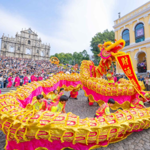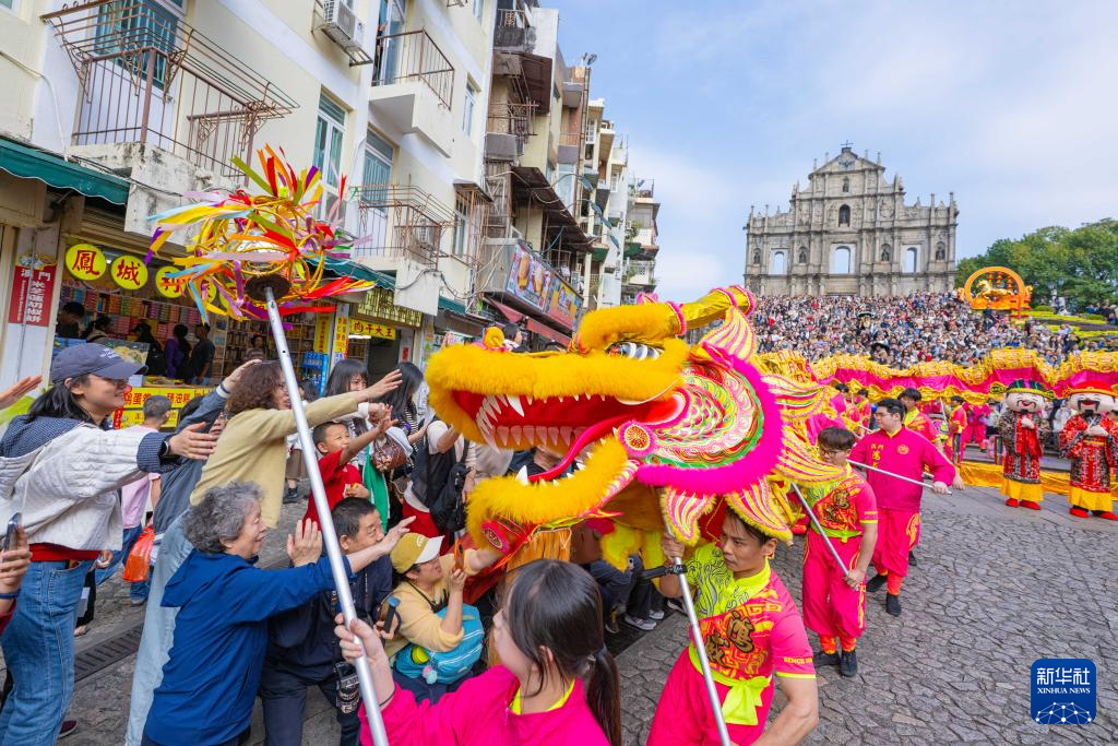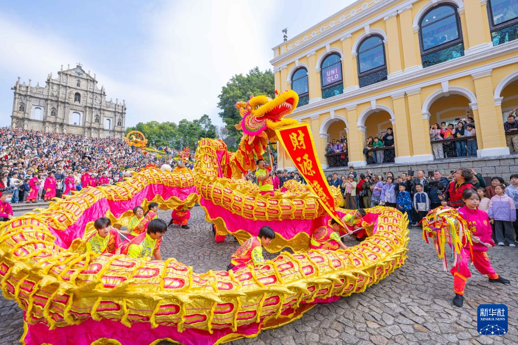 当日是大年初二,澳门旅游局在大三巴牌坊前组织舞龙舞狮等贺岁活动,吸引大批市民及游客驻足观赏。