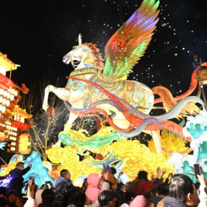 2月17日,游客在甘肃敦煌夜市举办的敦煌灯会上观赏花灯。