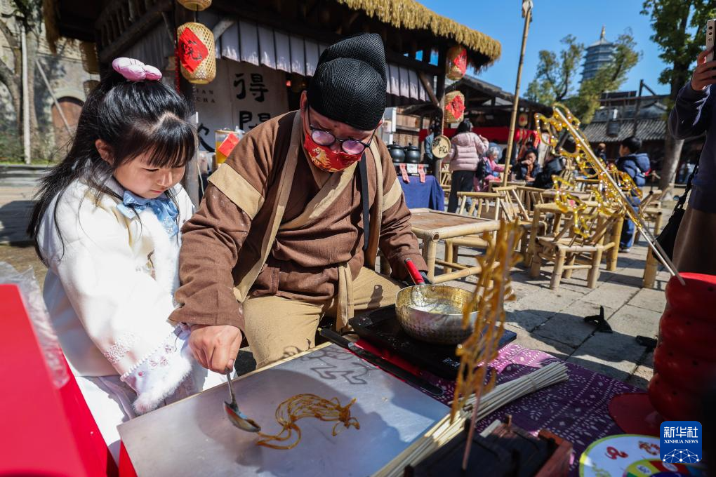 2月20日,身着传统服饰的糖画师向小朋友展示传统糖画技艺。