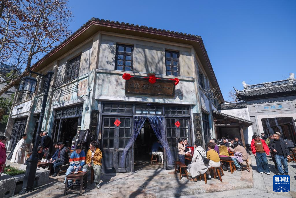 2月20日,游客在濮院时尚古镇的一元茶馆门口喝茶晒太阳。