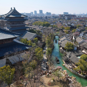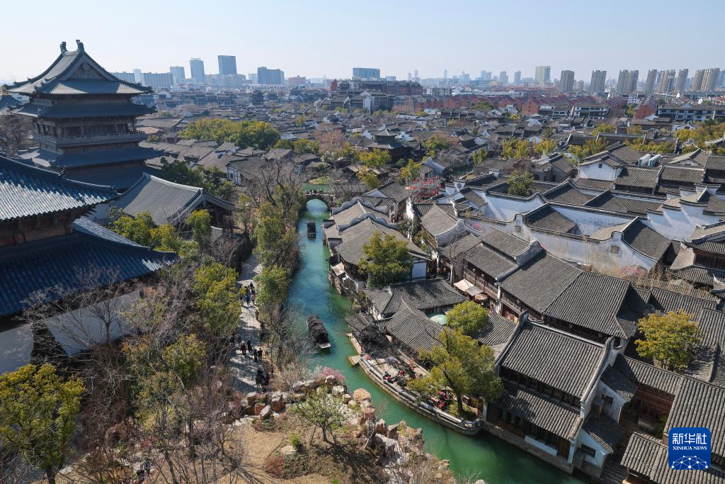 俯瞰春日暖阳中的濮院时尚古镇(2月20日摄)。
