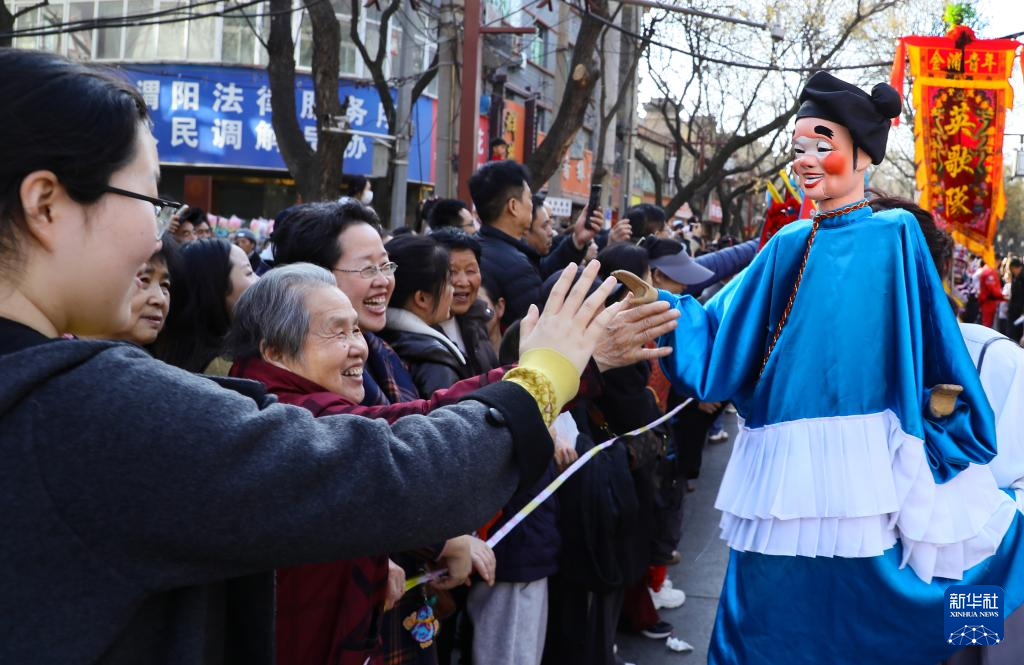2月20日,游人在陕西省咸阳市渭城区老街与演员操纵的木偶互动。