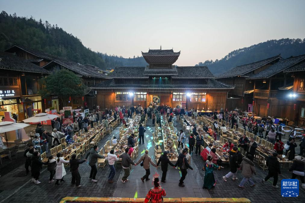 2月19日,游客在贵州省黎平县肇兴侗寨内参加长桌宴活动。